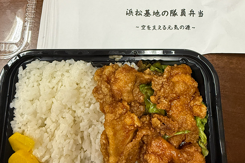 機動飛行が中止になったことで時間ができたので、そんな時は基地内の見学へ。この日は隊員食堂が一般開放していたので、そこで唐揚げ弁当をゲット!ブルーインパルスの展示飛行を心待ちにします。