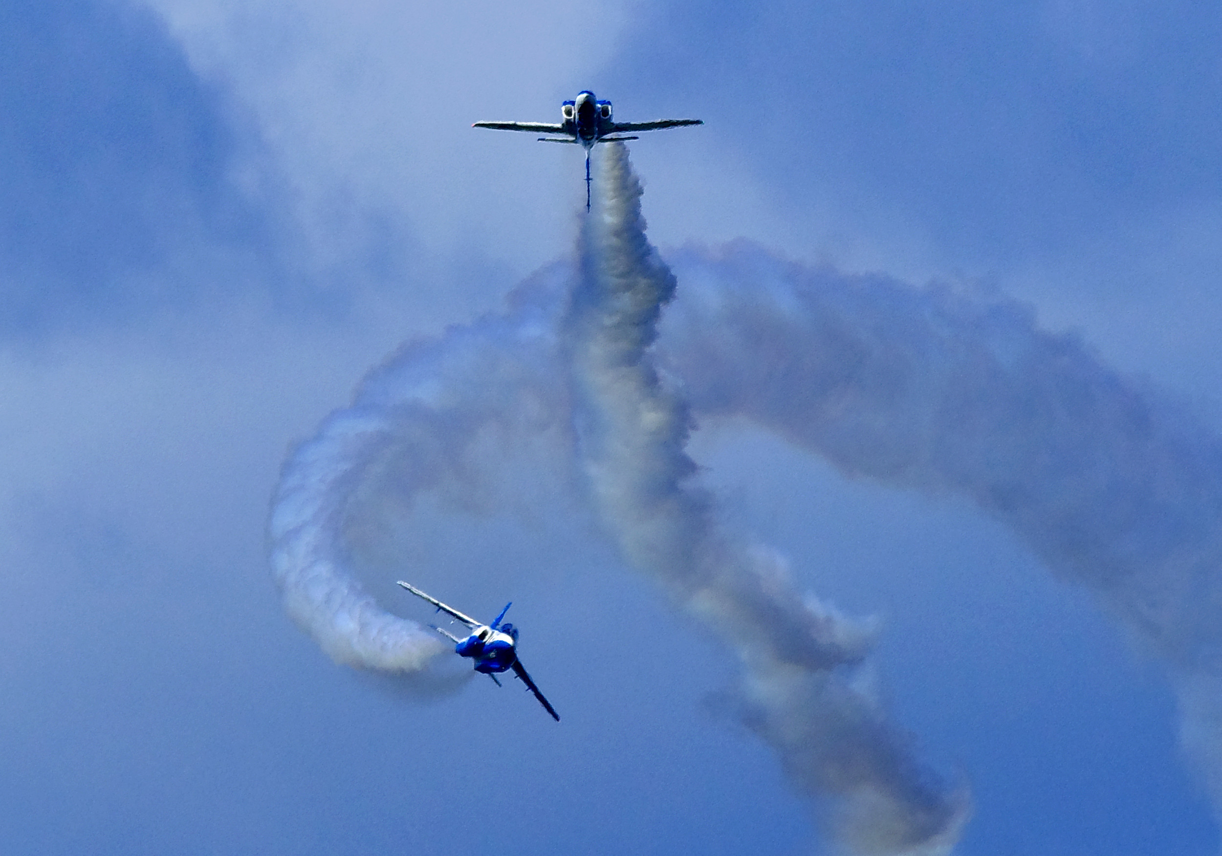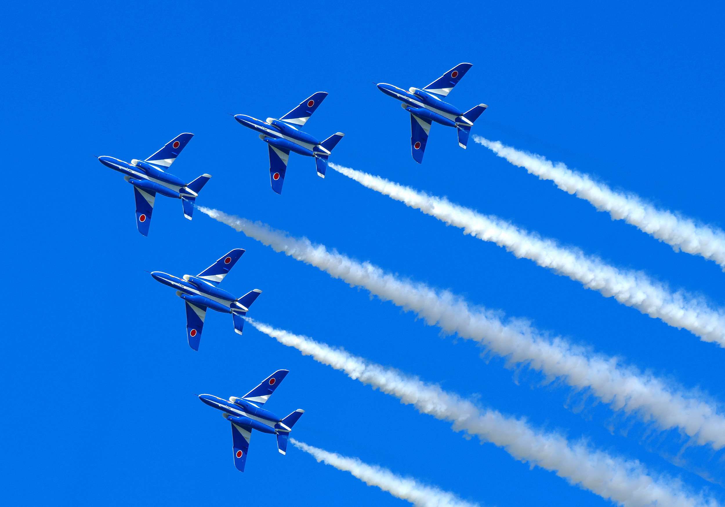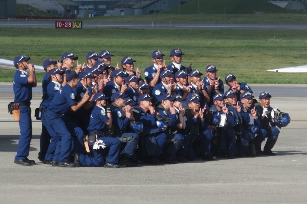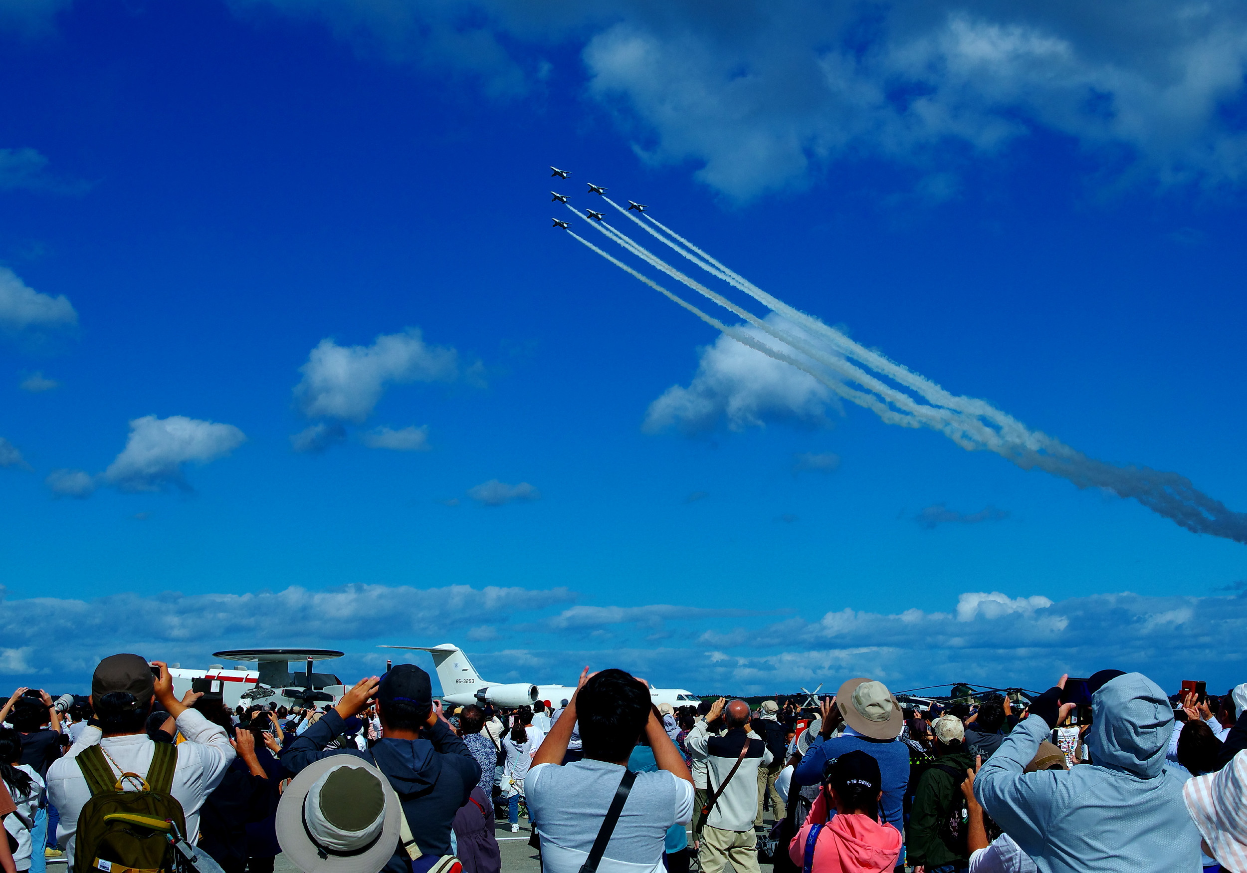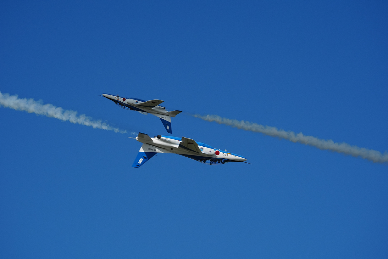 そうこうしているうちにブルーインパルスの展示飛行がスタート!最初は最も視界が良好な時に行われる第一区分での演目でしたが、徐々に風が強くなったのか、途中からは編隊飛行中心の演目に変更。こればかりはどうしようもないですね。
