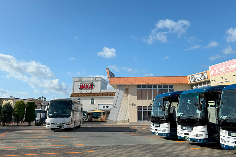 翌朝、窓の外を見ると昨日の豪雨が嘘かのような晴れ模様。基地の開門に合わせて7時にはホテルを出発、30分程度でバスの駐車場である「スカイプラザミサワ」へ到着。お客様は一目散に正門へ向かわれました。