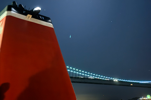 大阪南港を出港する頃にはすっかり日が暮れて、真っ暗な海に明石海峡大橋の夜景がキラリ。これから始まる旅への期待が高まります。